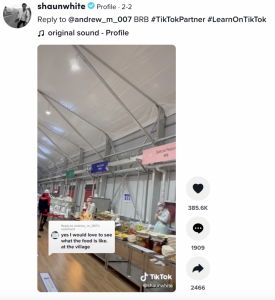 滑雪运动员、三届冬奥会冠军肖恩·怀特发布了一段视频,展示了冬奥村的自助餐厅,餐厅提供各种美食,包括披萨、意大利面、沙拉,当然还有中餐。