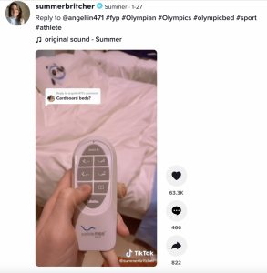 雪橇运动员萨默·布里彻分享了冬奥村里的“零重力智能床”,床是可遥控的,可以通过遥控对床的形态进行调整,与东京夏季奥运会期间运动员睡的纸板床形成明显对比。