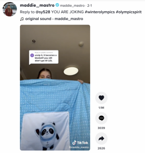 莫德的队友玛迪·马斯特罗展示了送给运动员的能变成毯子的抱枕。