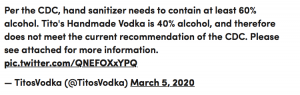 例如,当疫情消息传开后,人们开始发布使用Tito的伏特加做洗手液的消息,但这款伏特加并没有达到卫生部门的消毒标准,因其所含的酒精浓度少于60%。对此,品牌很快在社交平台上做出了回应,对公众传播的消息进行纠正。此后,厂家用自己的酿酒厂制造了24吨符合标准的洗手消毒液,顺势扭转了一次潜在的品牌危机。