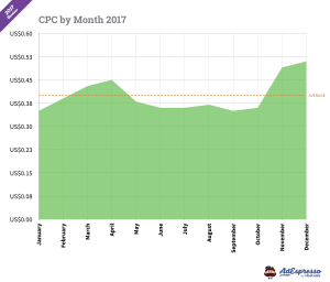 下面以2017年CPC(点击付费)成本为例,来看一下Facebook广告这方面的投入情况。(以下数据来自真实案例,仅供参考)