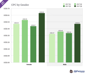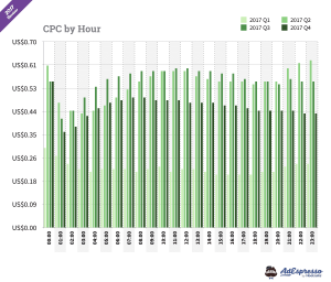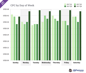第一季度里,周二的广告位最便宜,每个点击量花费为$.34。第四季度,周日的CPC最低,平均花费为$.40,周二和周四最贵,接近$.50。每个季度每周波动很大。