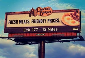 考虑到便捷性,餐厅和商店通常在距离店铺最近的告诉公路上置放广告牌。这些广告往往非常有效,它们会给出具体位置,吸引到有需求的人。对于驾车路上饥肠辘辘的人,看到附近的餐厅广告,很容易就会顺着广告牌上的位置前往。
