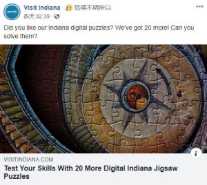 印第安纳旅游局别出心裁,制作了猜谜游戏,每个游戏里都有印第安纳的风景图,这些风景图都是本地居民和游客拍摄的。印第安纳旅游局鼓励人们完成这些猜谜游戏,不仅帮助用户打发无聊的隔离时间,也能大家对印第安纳的旅游景观有了更进一步了解。