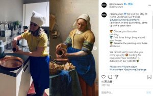 阿姆斯特丹国立博物馆在社交媒体上发起了有趣的与艺术有关的挑战活动。他们的#StayHomeChallenge活动,号召人们利用家里的用品重新创作他们喜欢的名画,分享在Instagram上。这场招募得到了很好的反馈,博物馆的粉丝群有不少人都发布了令人惊喜的作品。