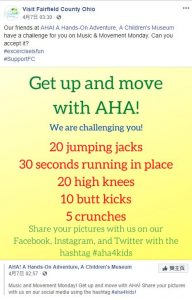 健康,已然成为全世界人们目前最为关注的话题。俄亥俄费尔菲尔德旅游局在社交媒体上发起了与用户互动的活动。他们号召父母和孩子参与他们在网上发起的挑战,每天做一系列的具有一定数量的锻炼动作,分享在社交媒体上。