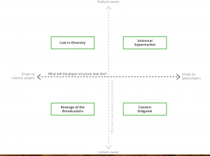 从上图中我们可以看出,未来的四大情景分别是:多样化中迷失,全球大市场,电视台出手反击,内容进入最后阶段。